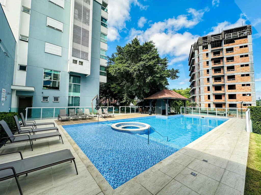 Apartamento mobiliado de alto padrão na Velha com 87,22m², 2 quartos (1 suíte), andar alto com vista livre e sol da manhã. 2 vagas cobertas e condomínio com infraestrutura completa.
