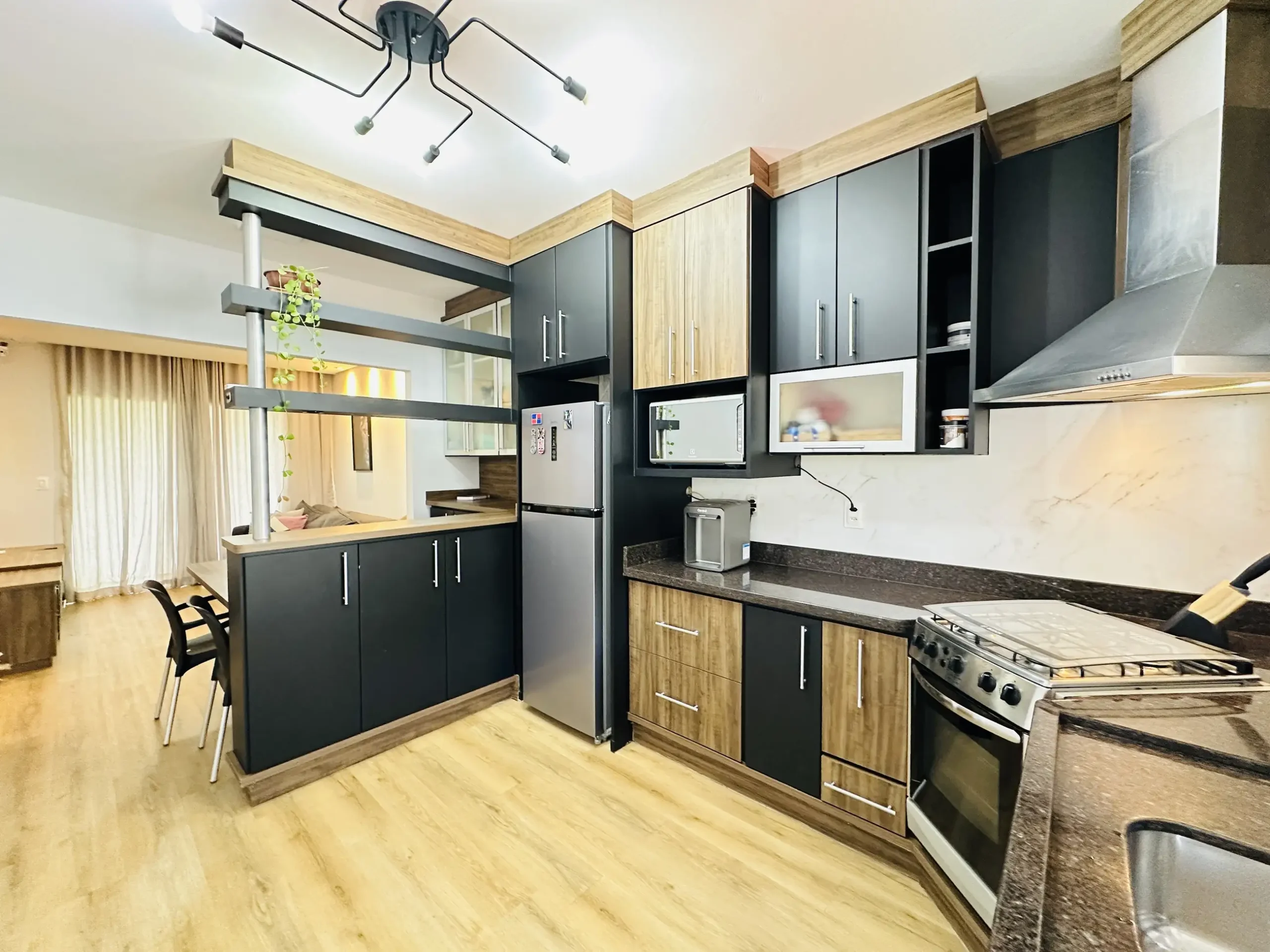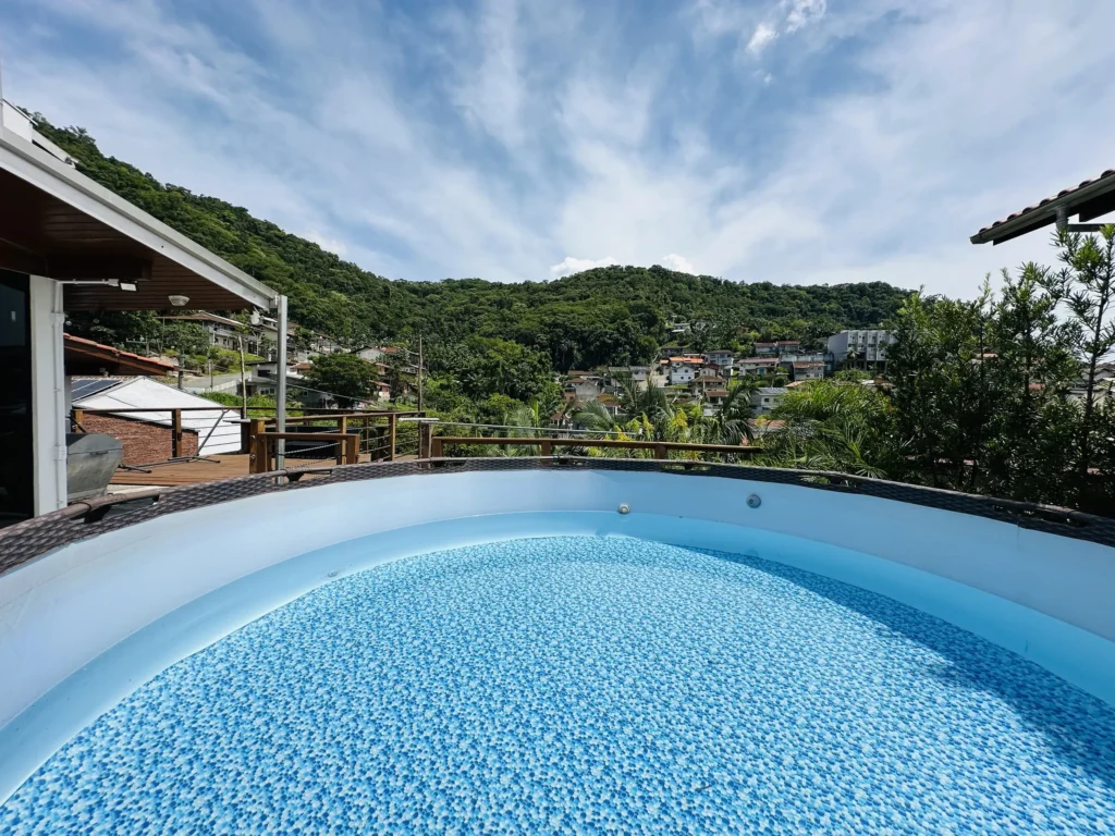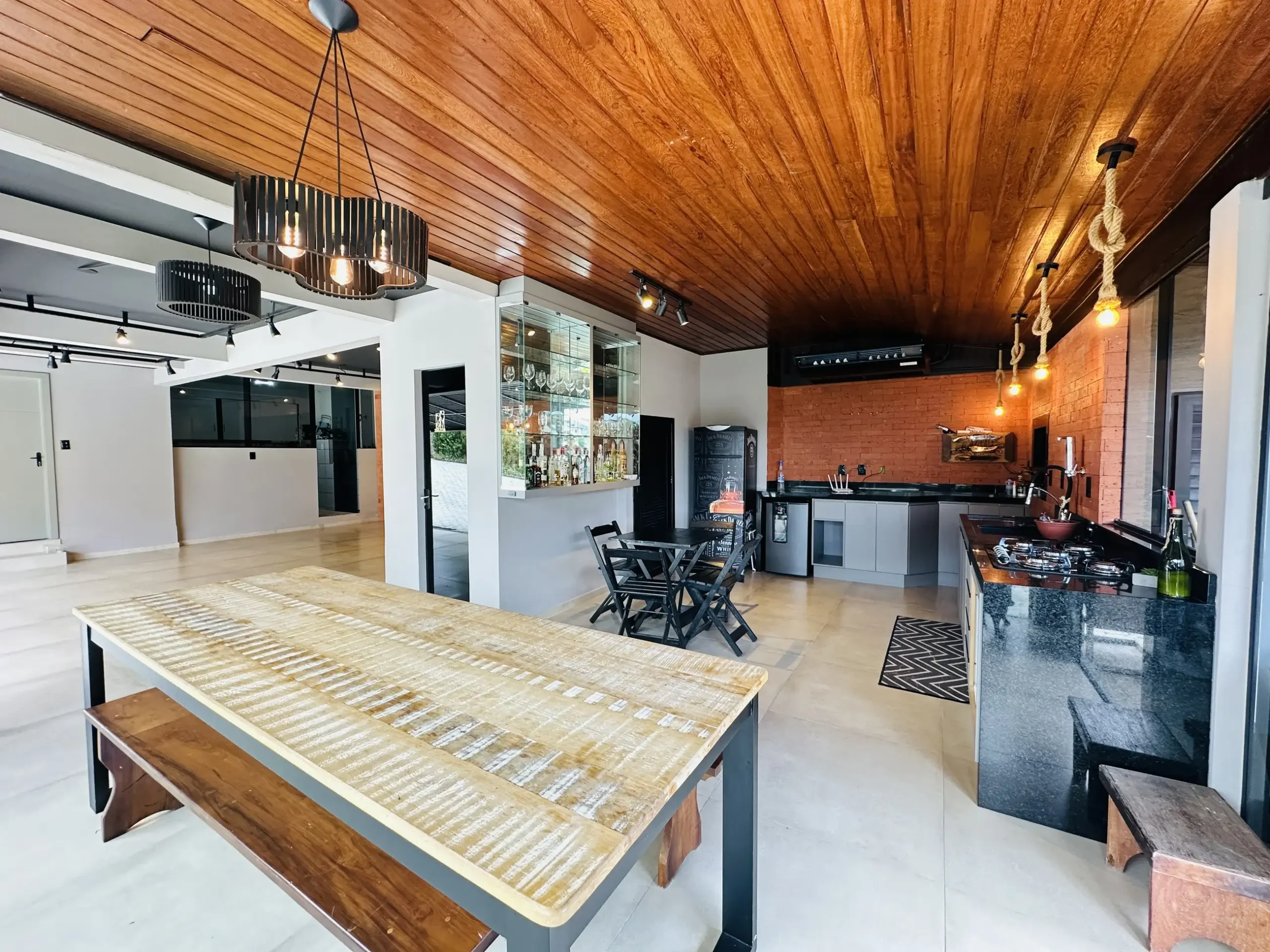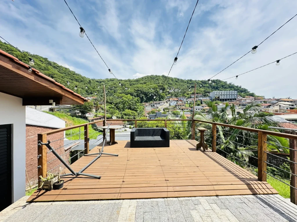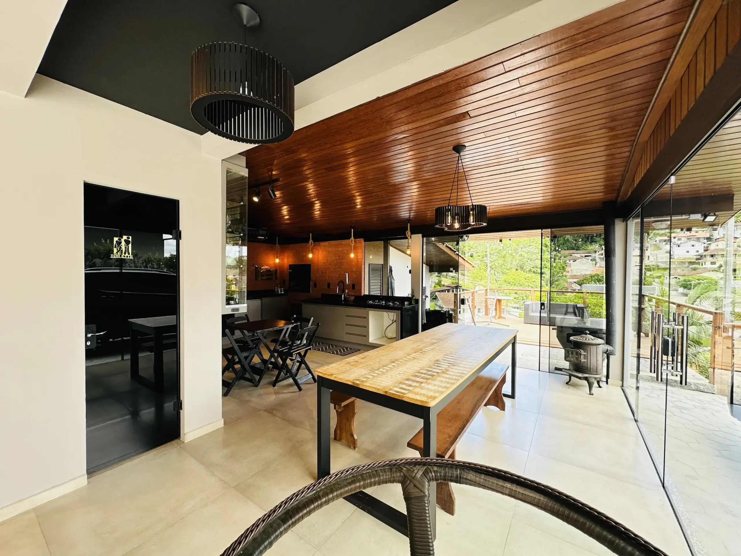 – Área de festas completa, com churrasqueira e fogão a lenha, integrada a um deck com vista encantadora;