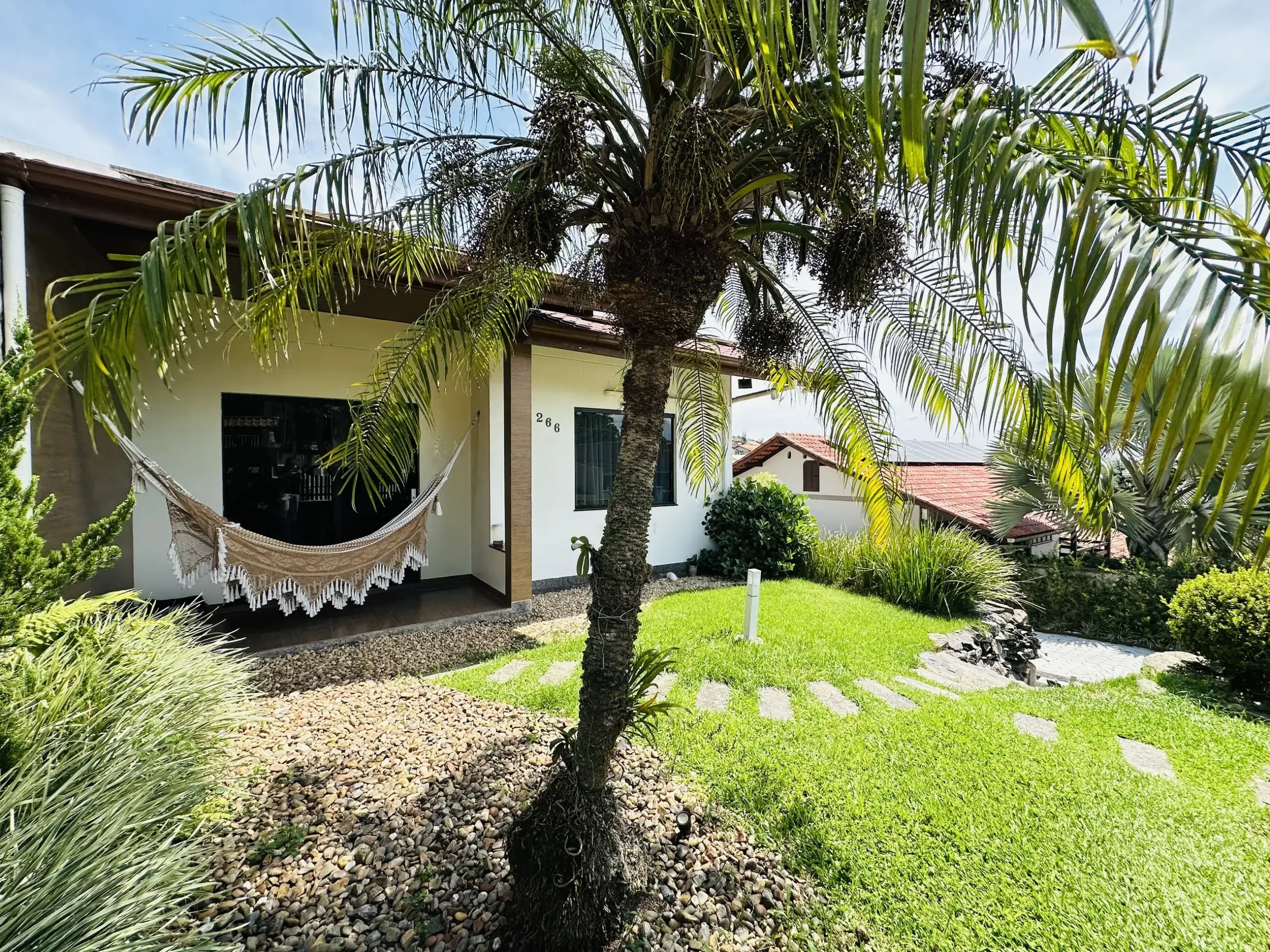 Casa mobiliada no Tribess com 190m², 3 dormitórios (1 suíte), área de festas com churrasqueira e fogão a lenha e amplo quintal. Terreno de 468m², energia solar e excelente localização em rua sem saída próxima a comércios.